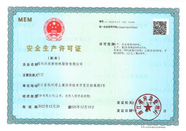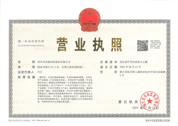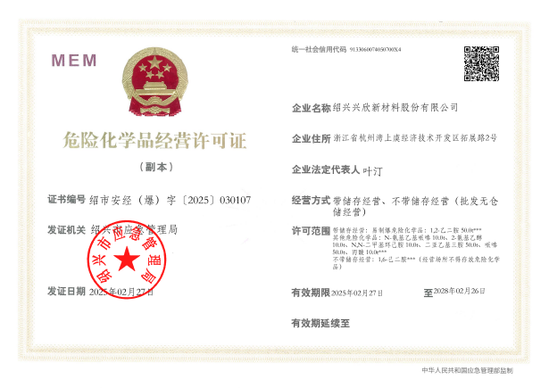 紹興興欣新材料股份有限公司成立于2002年06月27日,占地面積122畝,位于杭州灣上虞經濟技術開發(fā)區拓展路2號,現有職工200余人,專業技術人員50余人;博士、碩士研究生30余人組成的一支知識型、專業化的技術科研團隊。公司面向全球市場,專業開發(fā)電子化學品、環(huán)保化學品、醫藥中間體、高分子材料等先進新材料重點領域的省級科技型企業;建有浙江上虞、安徽東至兩個生產基地。目前為“國家高新技術企業”、浙江省“隱形冠軍”企業、浙江省專精特新中小企業;建有“省級”研究開發(fā)中心,共建天津大學浙江紹興研究院電子化學品研發(fā)中心。